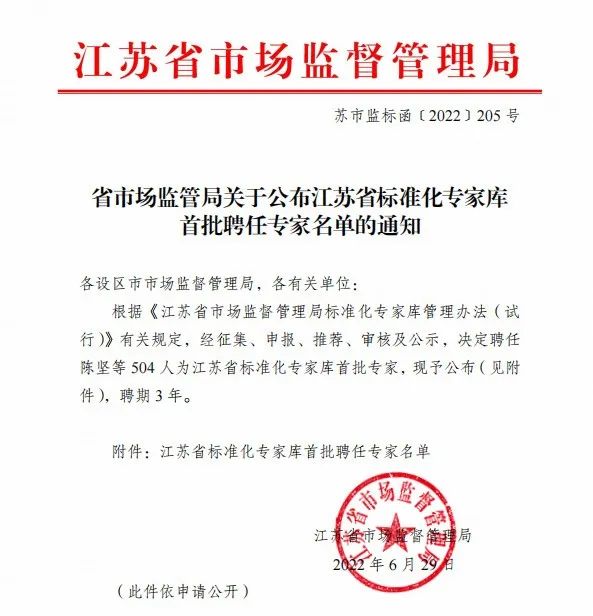 近日,江蘇省市場(chǎng)監督管理局發(fā)布文件(蘇市監標函[2022]205號),正式公布江蘇省標準化專(zhuān)家庫首批聘任專(zhuān)家名單。根據《江蘇省市場(chǎng)監督管理局標準化專(zhuān)家庫管理辦法(試行)》有關(guān)規定,經(jīng)征集、申報、推薦、審核及公示等環(huán)節,首批聘江蘇省標準化專(zhuān)家504名,巨納集團董事長(cháng)丁榮獲聘為“江蘇省標準化專(zhuān)家庫”首批聘任專(zhuān)家。